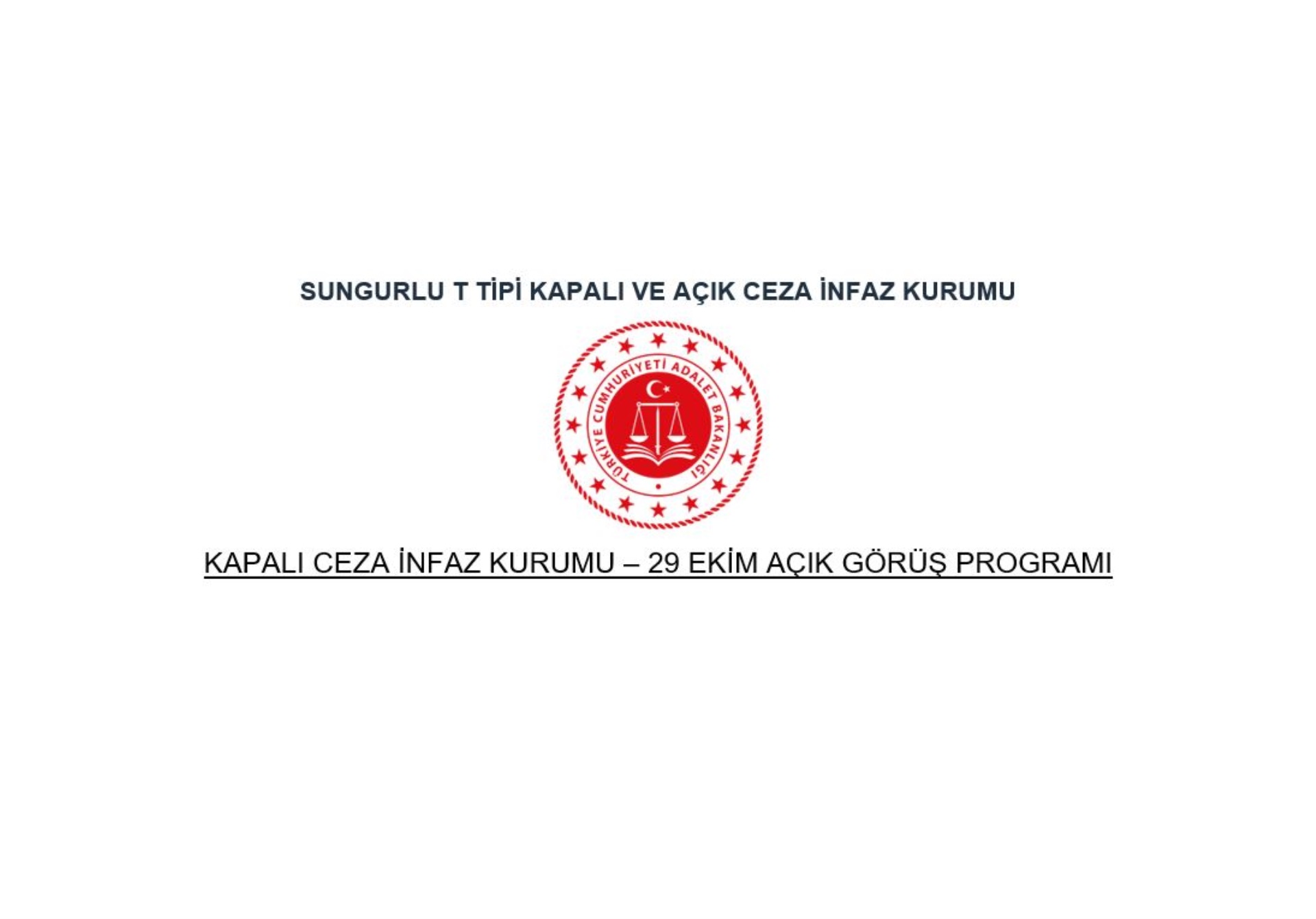 SUNGURLU T TİPİ KAPALI CEZA İNFAZ KURUMU 29 EKİM CUMHURİYET BAYRAMI AÇIK GÖRÜŞÜ 27-30 EKİM 2025 TARİHLERİ ARASINDA YUKARIDA BELİRTİLDİĞİ ŞEKLİYLE GERÇEKLEŞTİRİLECEKTİR. | ||||||
